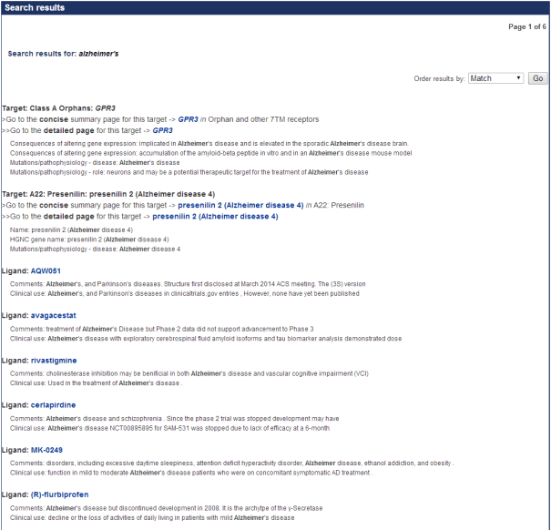 One of our curators, Chris Southan, has completed work on a case study for the curation of drugs and targets involved in Alzheimer’s disease. This project has seen the addition of new approved drugs, compounds in clinical trials and research compounds to the database, all with their pharmacology curated from the literature. The ‘biological activity’ tables and comments for these ligand pages now include patent data in cases where there are SAR data for compounds or analogues. Our database can also now be searched by disease name to retrieve ligand and target pages. Here’s an example of a search using the term ‘Alzheimer’s’: