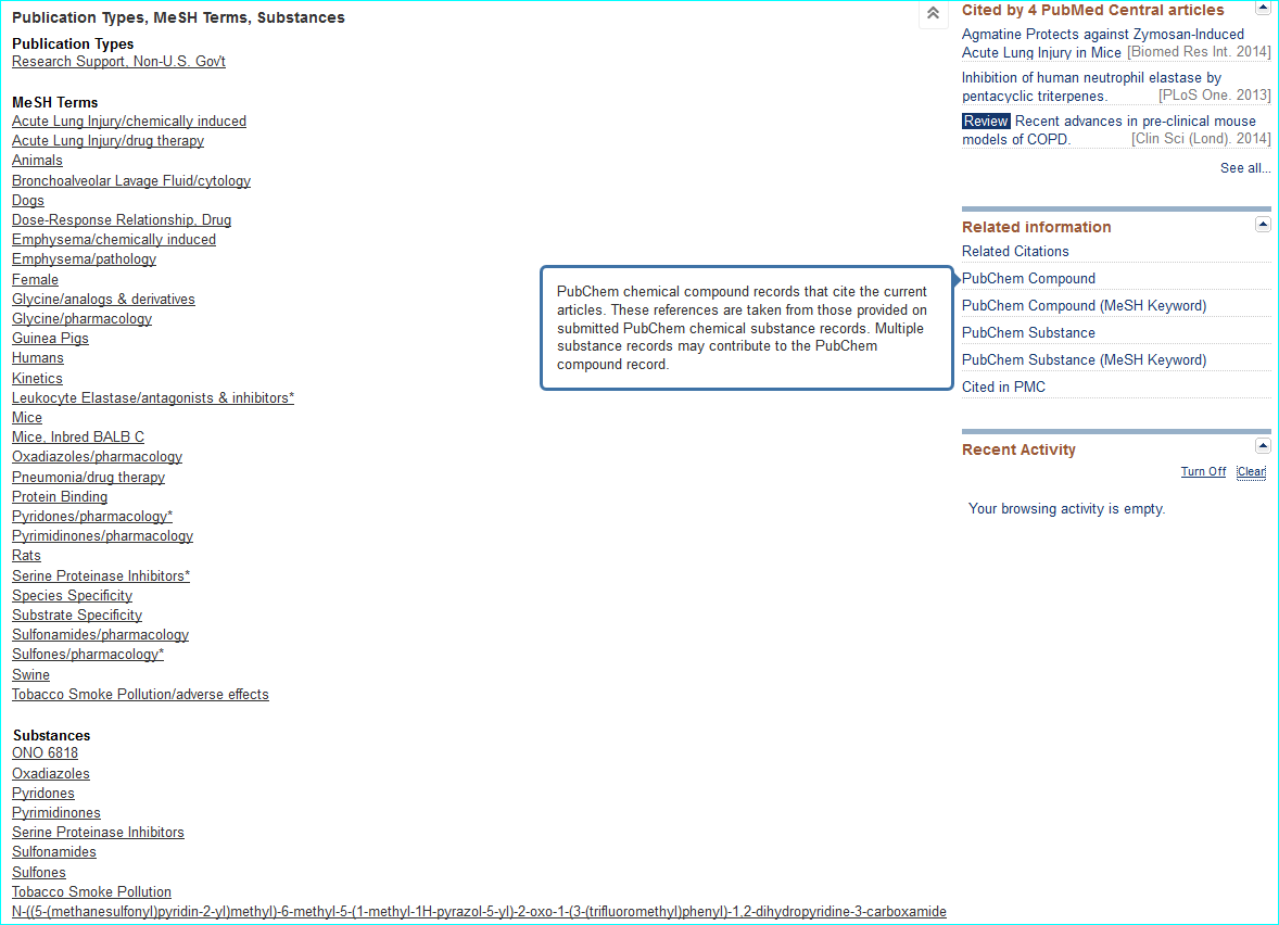 Compound. Public database chemical identifiers (e.g. PubChem, ChemSpider, ChEBI, DrugBank or ChEMBL) or commercial ones (e.g. CAS registry numbers) are not yet widely used in papers. For medicinal chemistry journals in particular, structures can be obscurely labelled in SAR tables as “11h”, or even as Markush-type enumerations. However they are usually made explicit via structure images in Results and/or as IUPAC names in M&M. Where names are used for “C” the following are useful a) a shorthand biochemical name b) a company code name c) an INN or d) an English/US brand name. For a PMID MeSH can be a useful first-pass for entity resolution. You can inspect this by opening up the terms under the PubMed text and also see what is linked under “Related information” on the lower right of the page. The links for the AZD9688 paper are shown below.