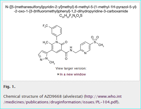 The AZD9668 paper is an easy case, since it exemplifies the structure as an image, an IUPAC name, along with the INN link for alvelestat.