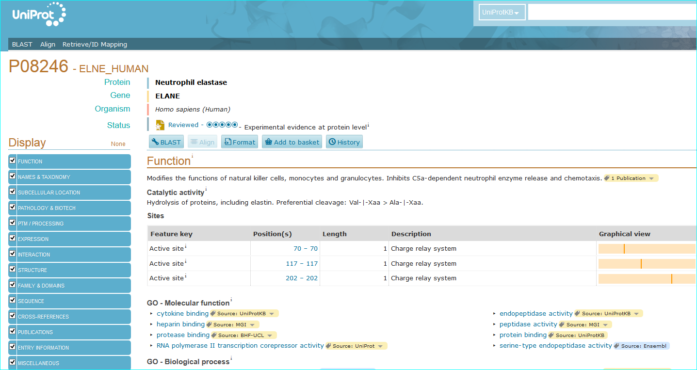 Protein. The use of standardised names and accession numbers to enable the resolution of “P” is more common than for “C” entities in papers. Nevertheless, ambiguity can still be a problem. As you can see in GtoPdb, we cross reference commonly used protein or gene identifiers, including our own NC-IUPHAR nomenclature. For many reasons we use the UniProt ID as an unequivocal, species specific, primary identifier, which, for human proteins, is the Swiss-Prot ID. We can also use the approved HGNC symbol. For those more familiar with the NCBI-world of annotation, a RefSeq NM or NP is aOK for us, but an Entrez GeneID is preferable. In cases where the paper specifies a protein complex you may be able to resolve this to the constituent subunit IDs (but we can check this). In the AZD9688 paper the protein name “Neutrophil Elastase” can be resolved to UniProt P08246.