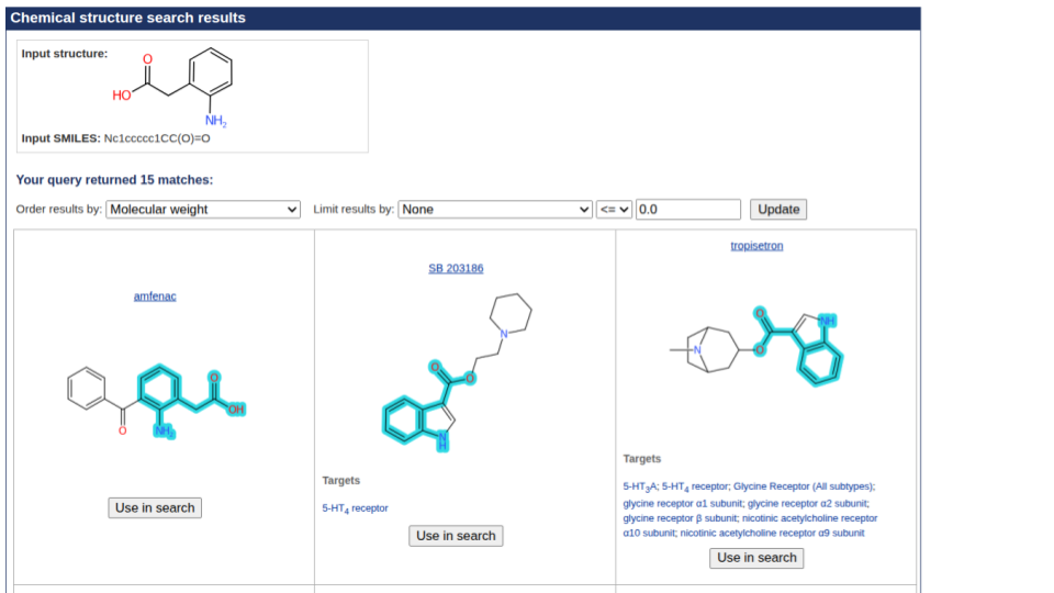 The below shows an example of a result set from a substructure search. Showing the query structure highlighted (in cyan).